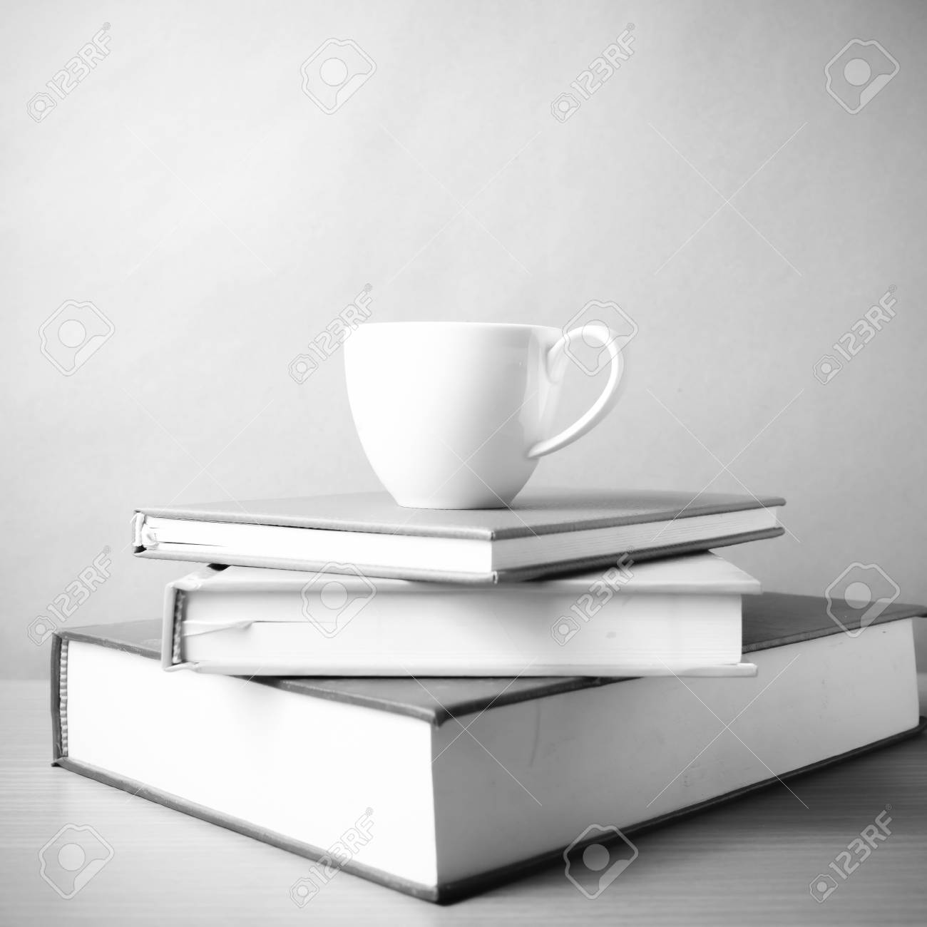 Stack Of Book With Coffee Cup On Wood Table Background Black