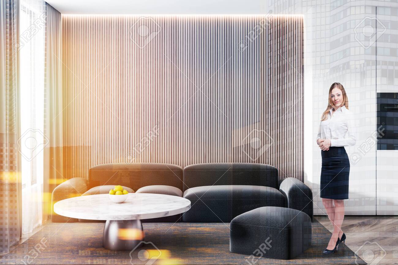 Blonde Woman In Formal Clothes Standing In Living Room Interior
