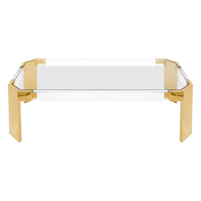 Lucite And Brass Modern Rectangular Coffee Table With Glass Top